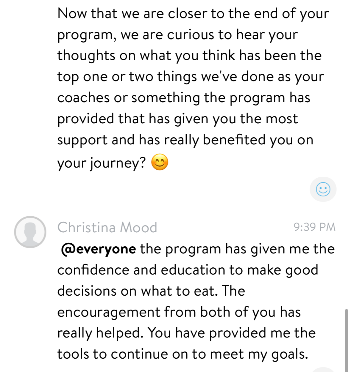 - Recommends the program to anyone who feels confused with nutrition or struggles with body image.