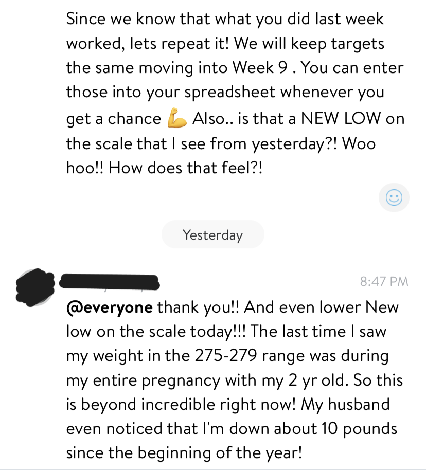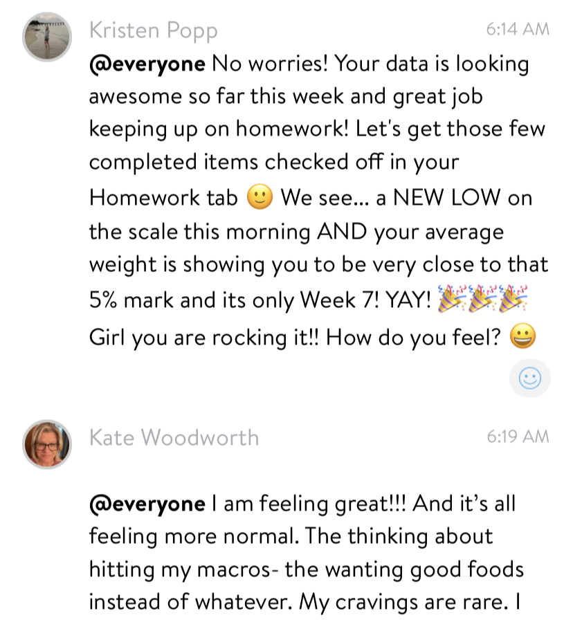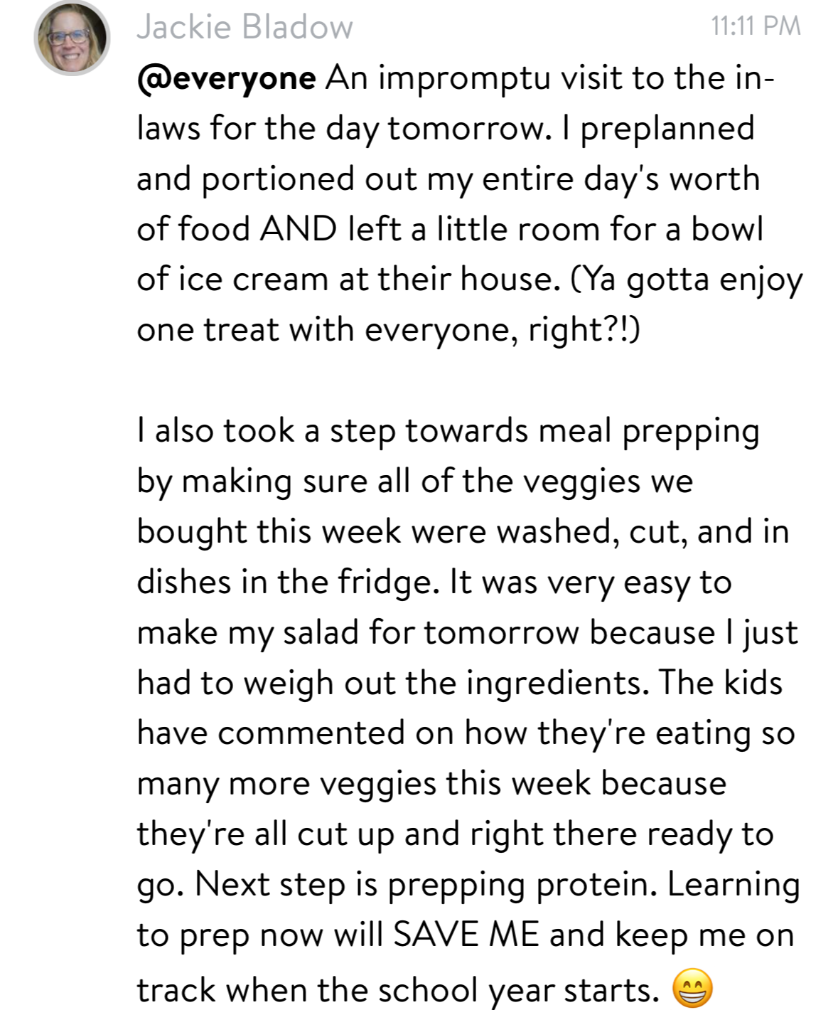 - Learned that she can still eat the foods she loves and lose weight. (Already down 7lbs at 9 weeks into the program.)
