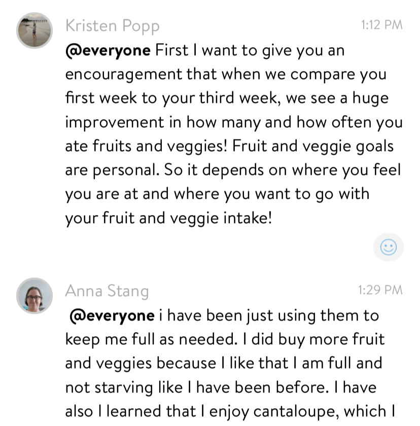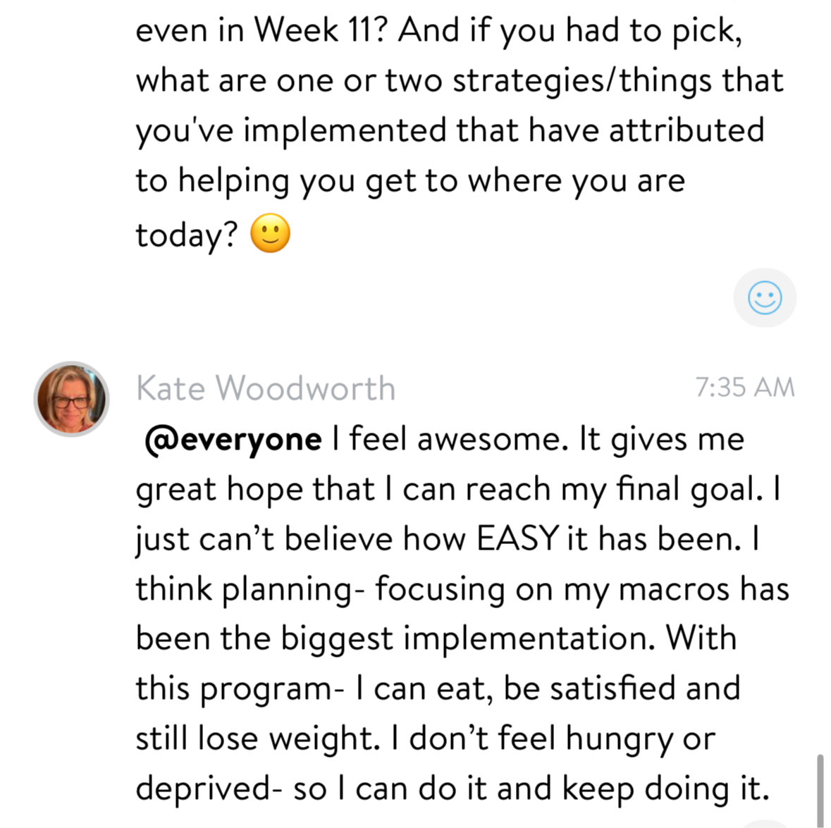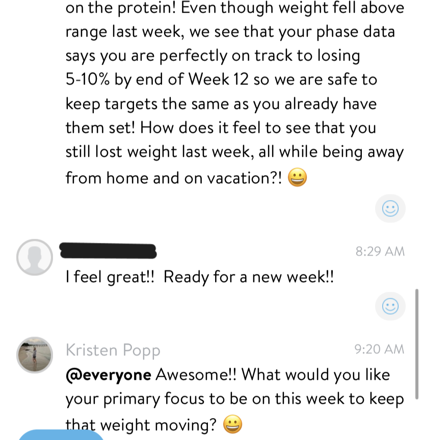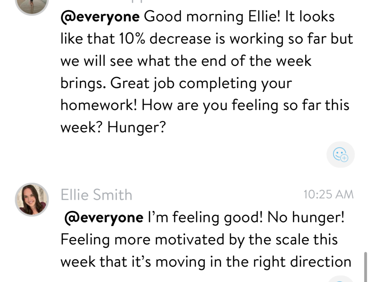 - Learned that she can still eat the foods she loves and lose weight. (Already down 7lbs at 9 weeks into the program.)