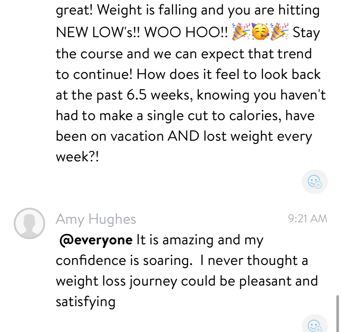 - Learned how to eat to lose weight and now has confidence in food choices